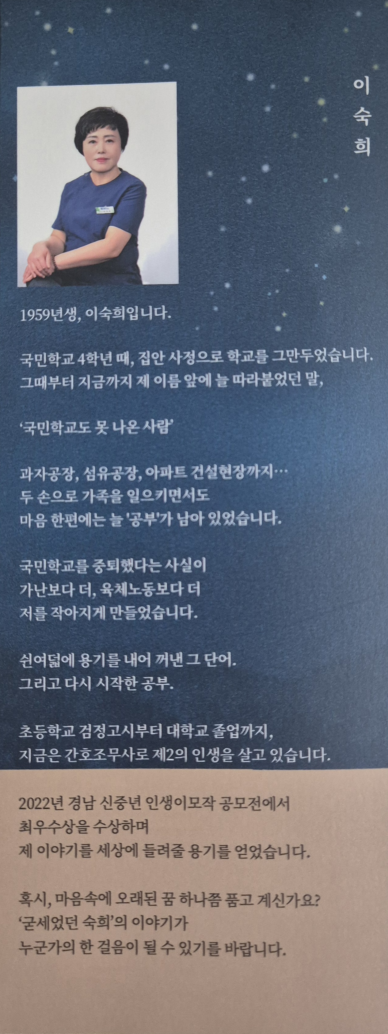 이 자서전은 초등학교를 졸업하지 못한 한 여성이, 58세에 시작한 초·중·고 검정고시를 모두 통과하고 마침내 대학을 졸업하기까지의 여정을 담고 있습니다. 그리고 그 여정 속에는 단순한 ‘늦깎이 공부 이야기’ 이상의, 뭉클한 인생이야기들이 펼쳐집니다.